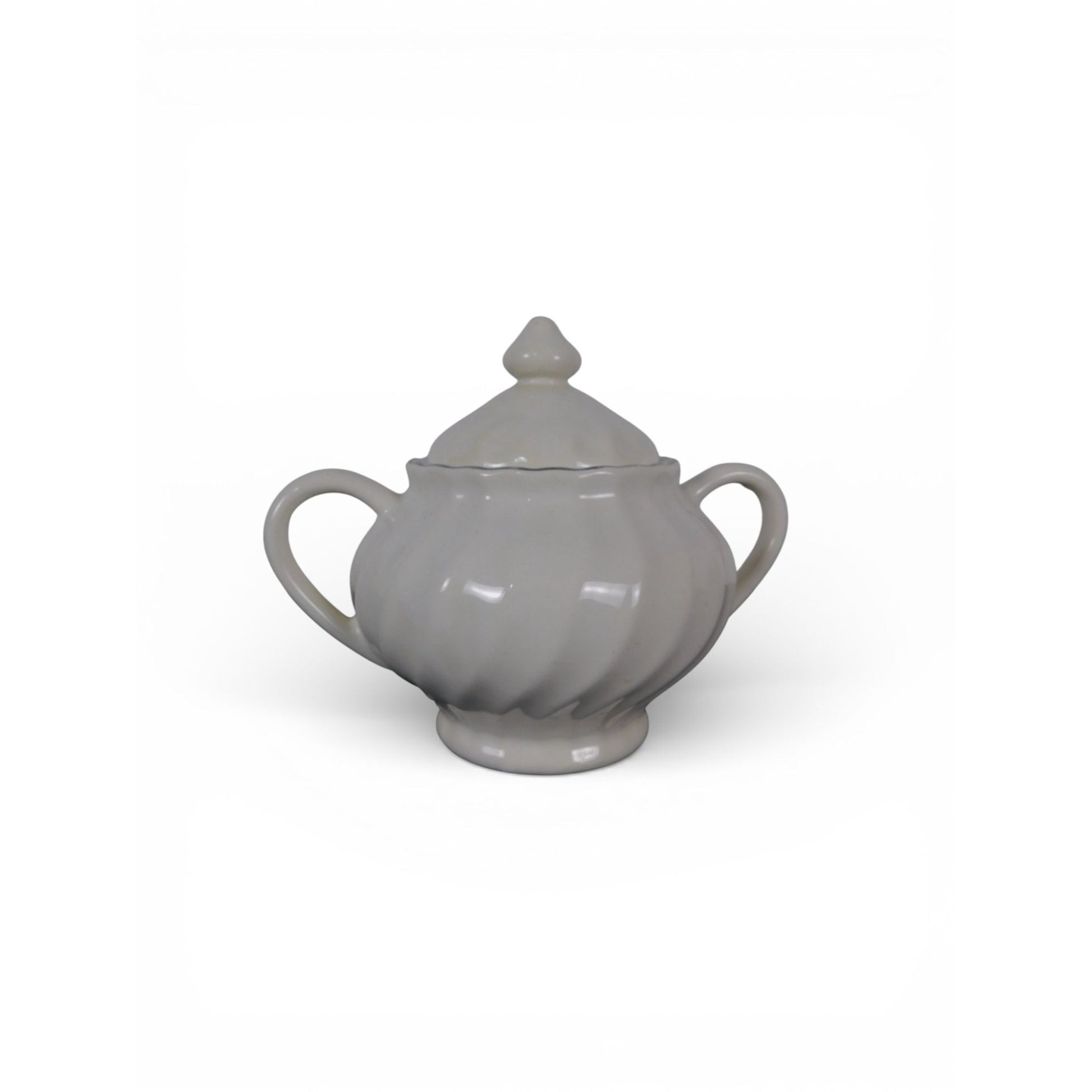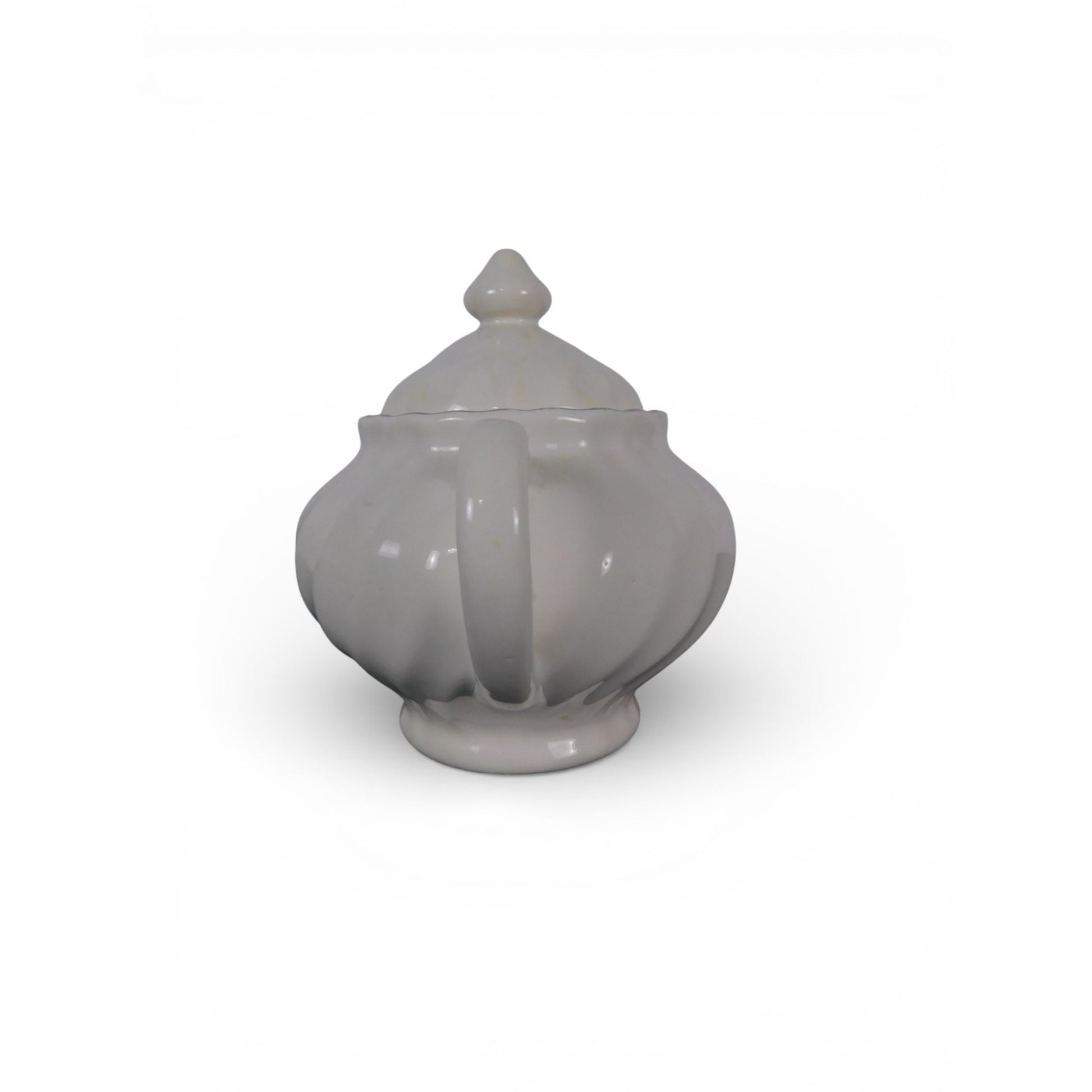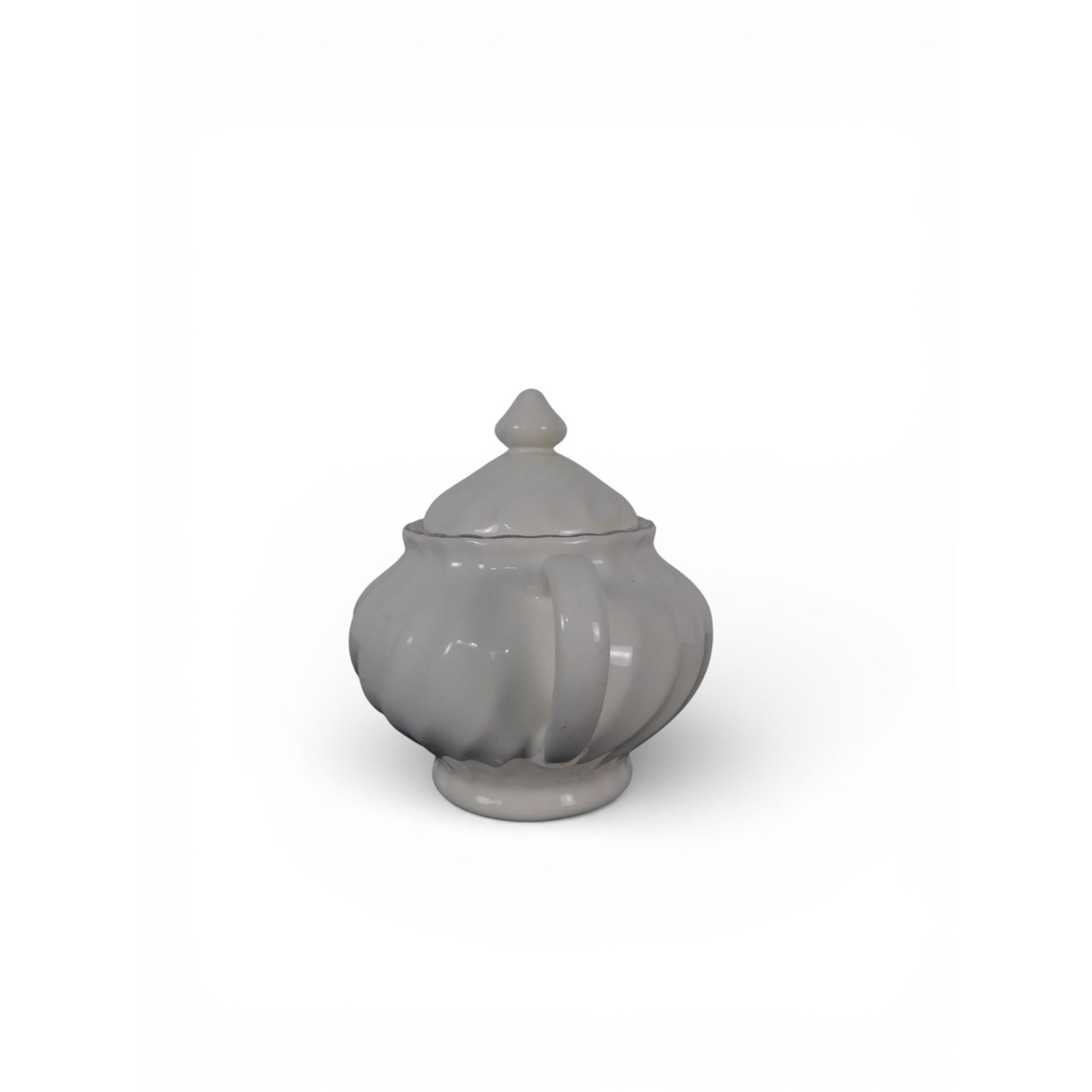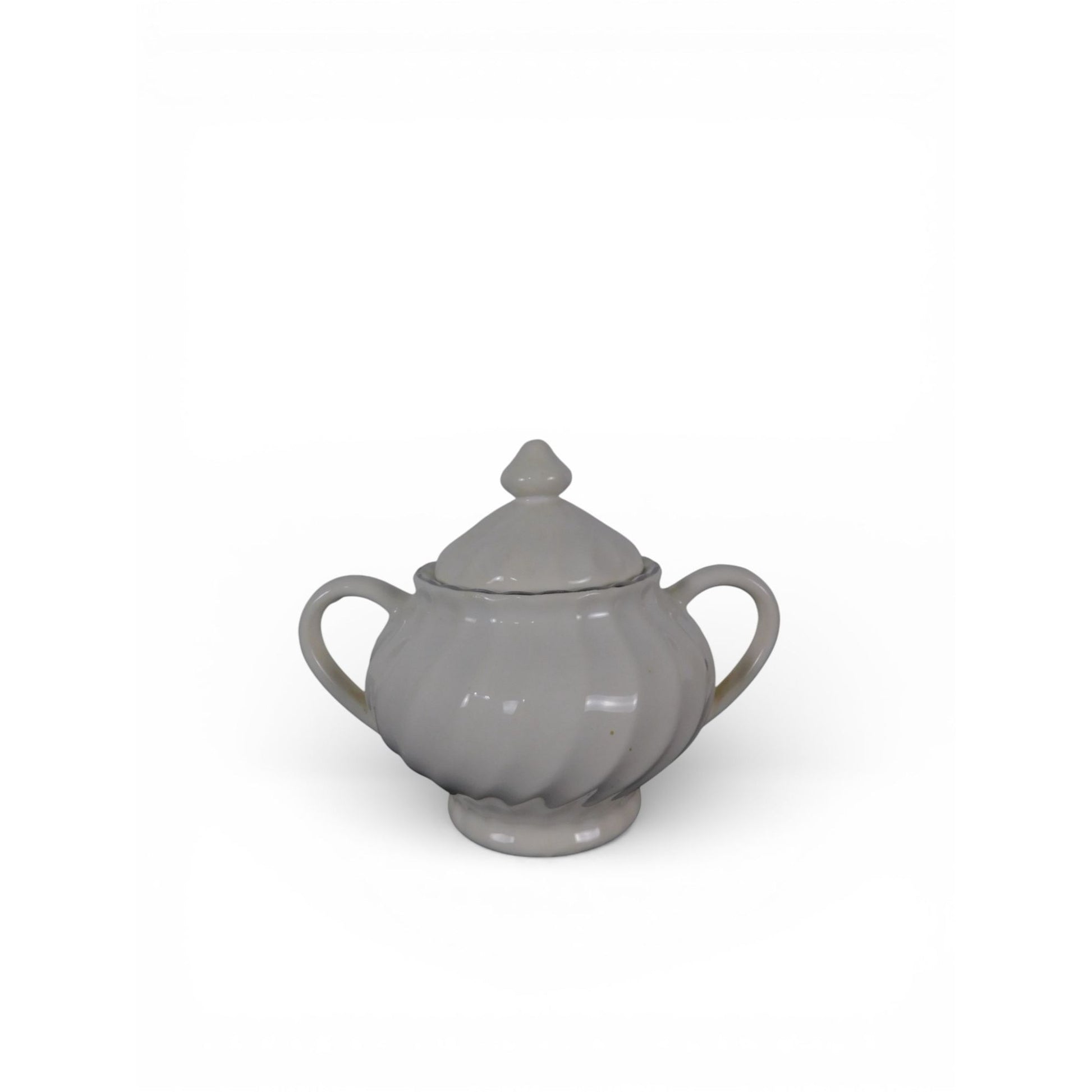 Charming vintage white ceramic sugar bowl with a softly scalloped body, double side handles, and matching domed lid with finial knob. The simple, classic form works well for traditional tables, tea service, or neutral cottage-style décor.