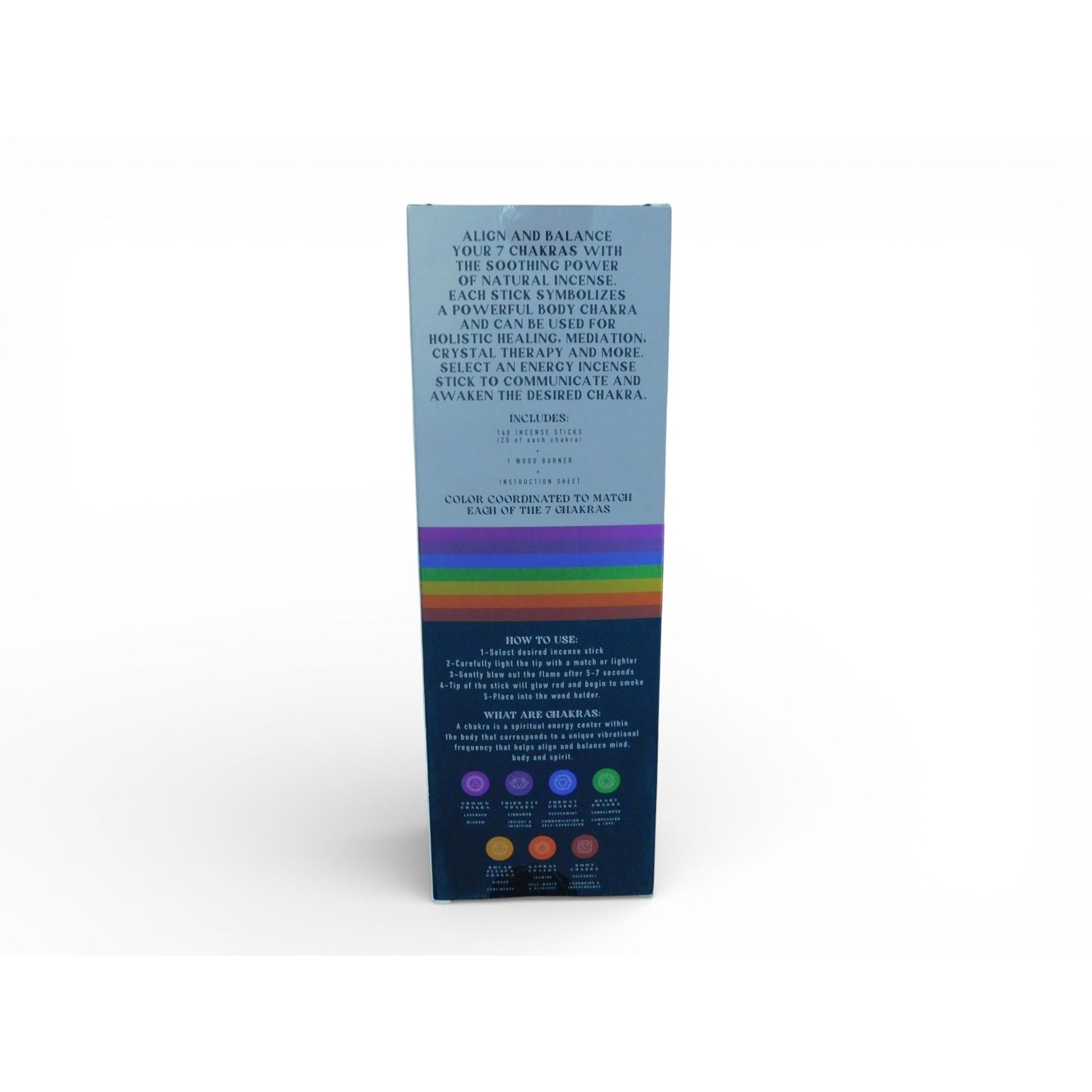 Aligns chakras, promotes relaxation, and enhances meditation with natural incense sticks and burner. Includes scents for each chakra.