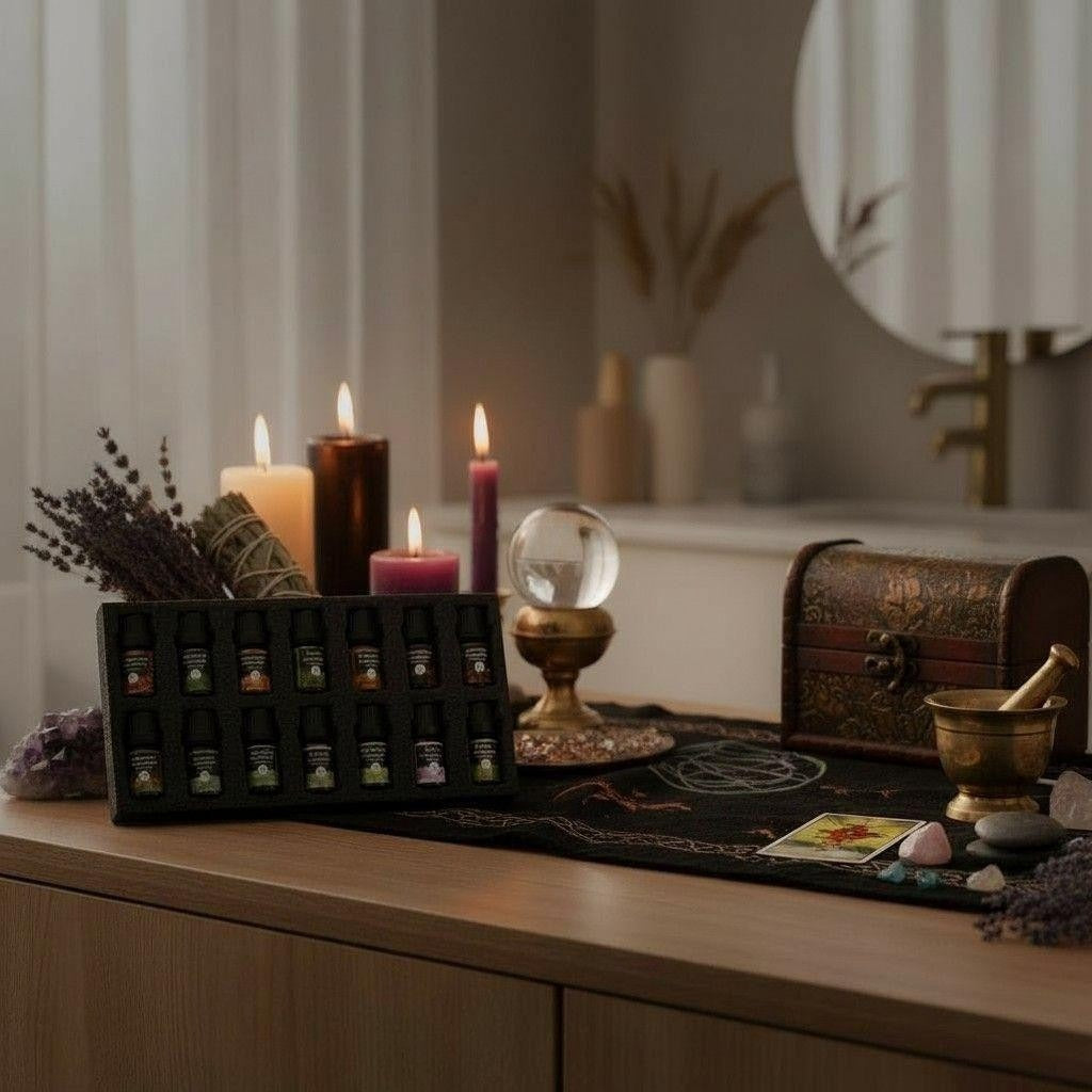 Scents: selection of woody and herbal oils such as sandalwood, cedarwood, frankincense, cardamom, cypress, rosemary, geranium, thyme, peppermint, agarwood, clary sage, mugwort and lemongrass