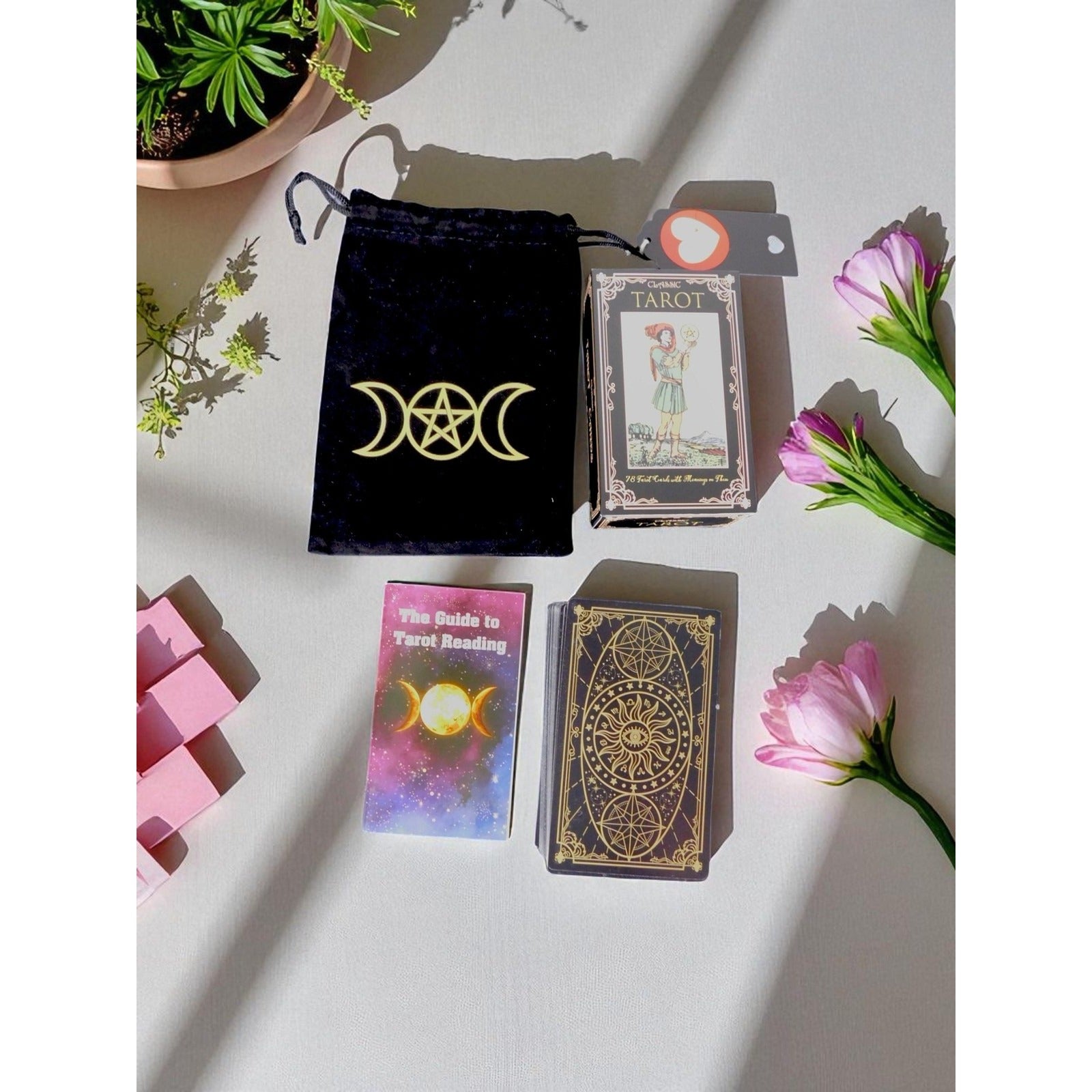 Unlock cosmic wisdom with this brand new Classic Tarot Card Deck, a 78-card Rider-Waite style set with upright and reversed meanings on each card. Gold-accented black card backs with astrology motifs, vibrant guidebook, and velvet pouch with triple moon and pentagram designs. Packaged in a decorative box. Brand new, no flaws. Ideal for beginners or astrology lovers. Pair with a star pendant for Celestial Witch vibes. Ships swiftly from The Witch’s Quest. Explore more altar essentials at thewitchesquest.com