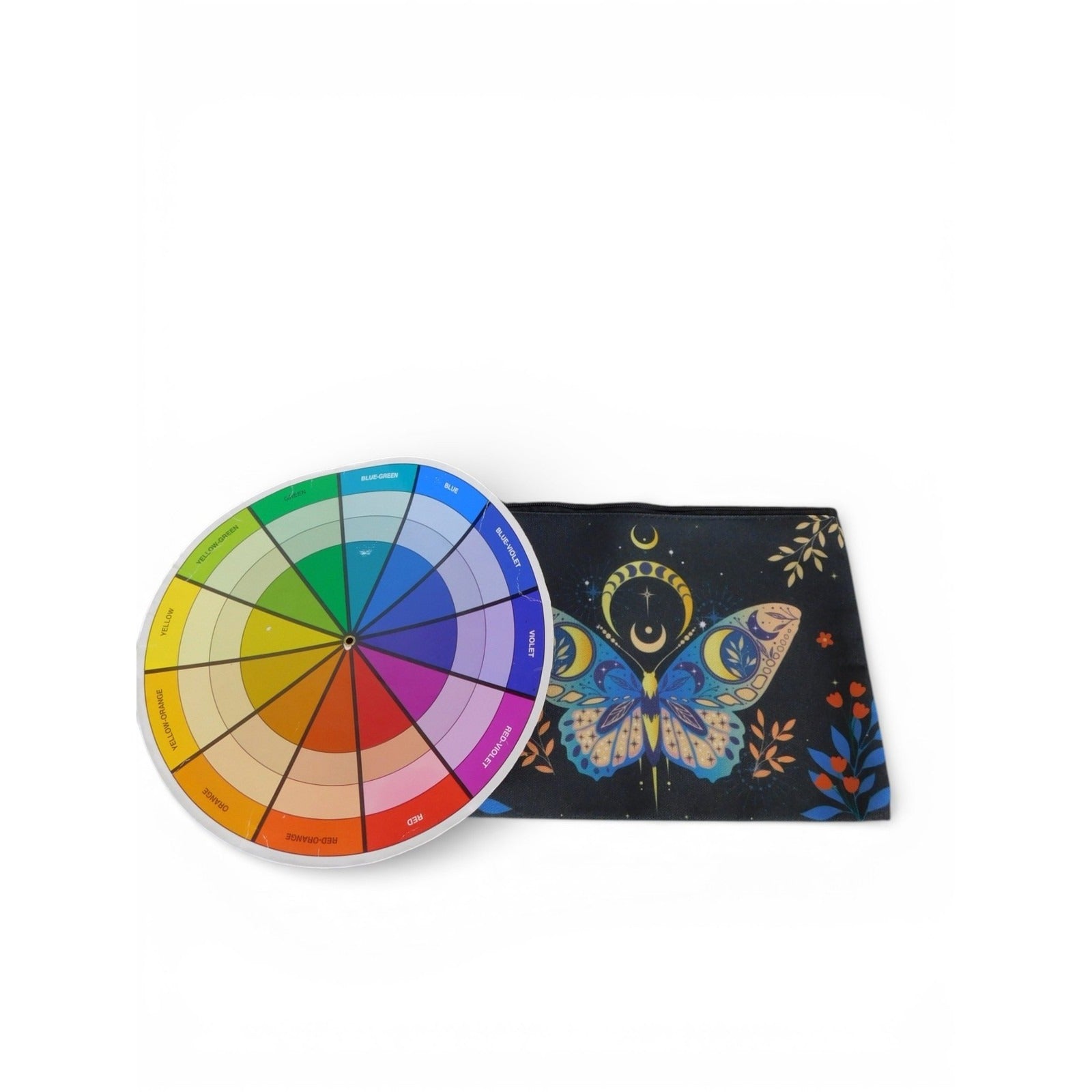 Color: Black exterior with multicolor blue, gold, and orange design featuring butterfly, moons, stars, and flowers; solid black back panel.