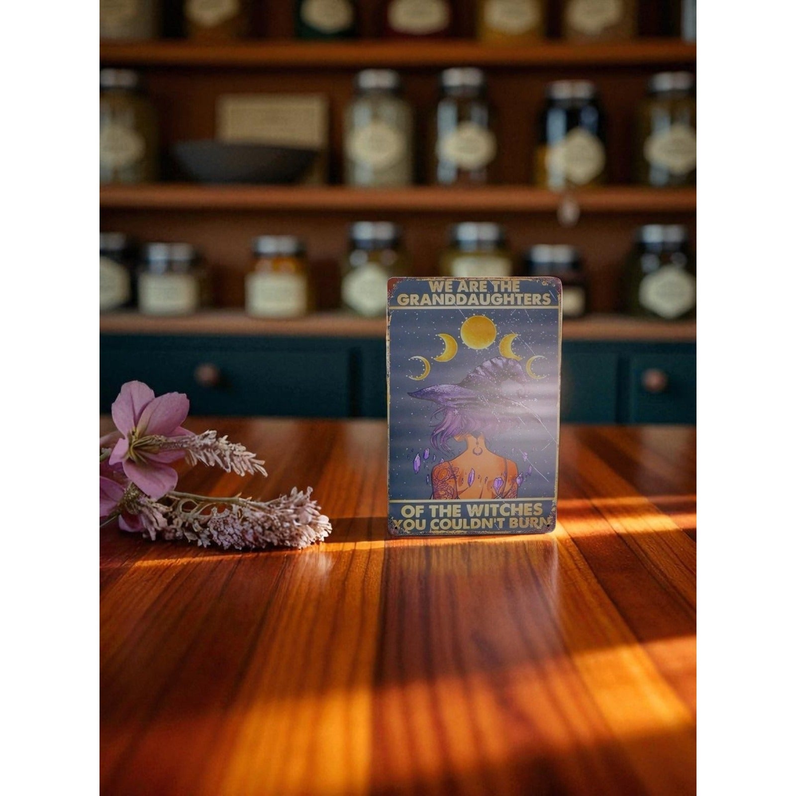 Claim ancestral fire with this NWT 8" x 11.5" tin sign—purple-haired witch crowned in moon phases & stars, gold vintage script proclaims “We Are The Granddaughters Of The Witches You Couldn't Burn.” Distressed edges, pre-drilled holes; perfect coven wall or altar backdrop. Ethereal & Elemental empowerment. The Witches Quest curation.