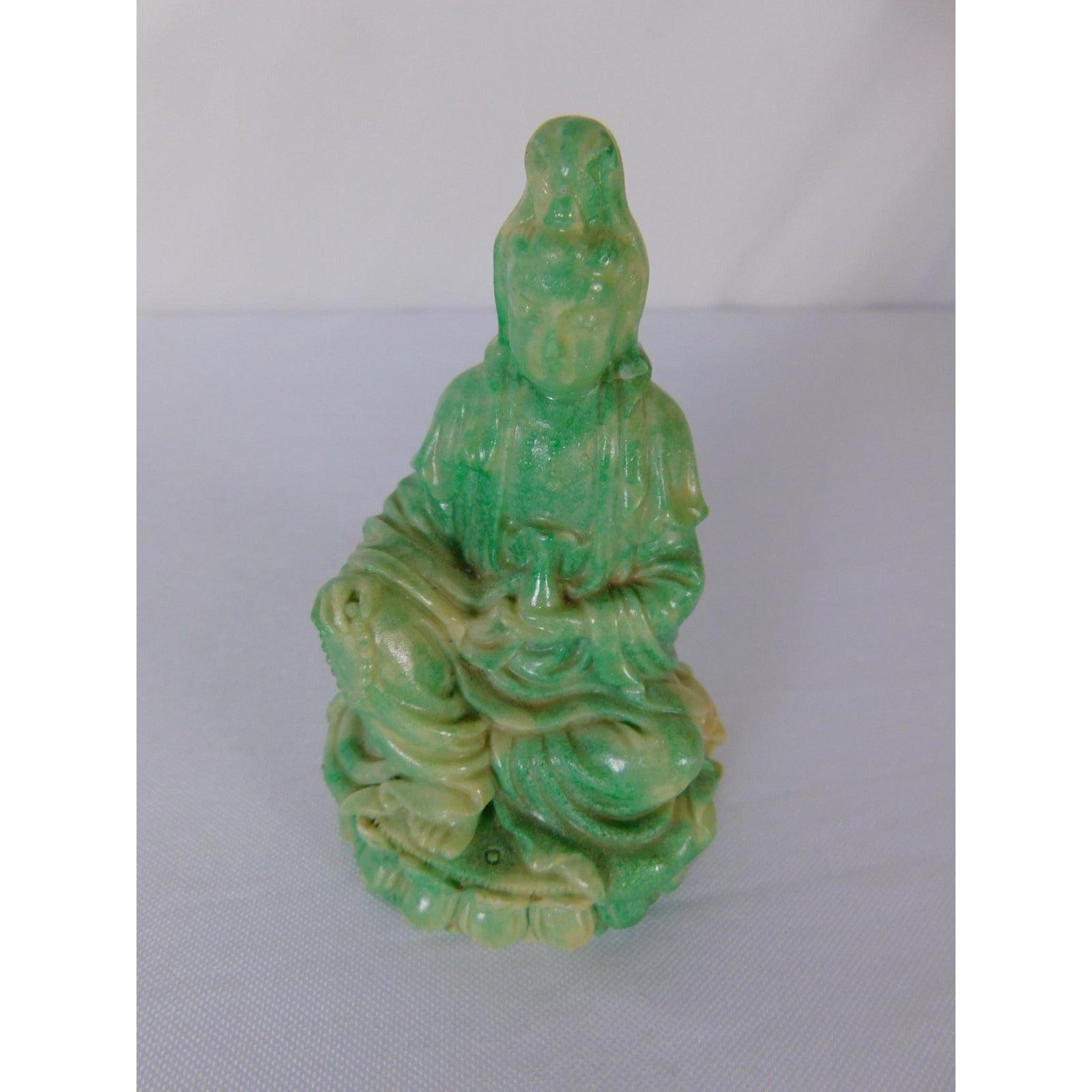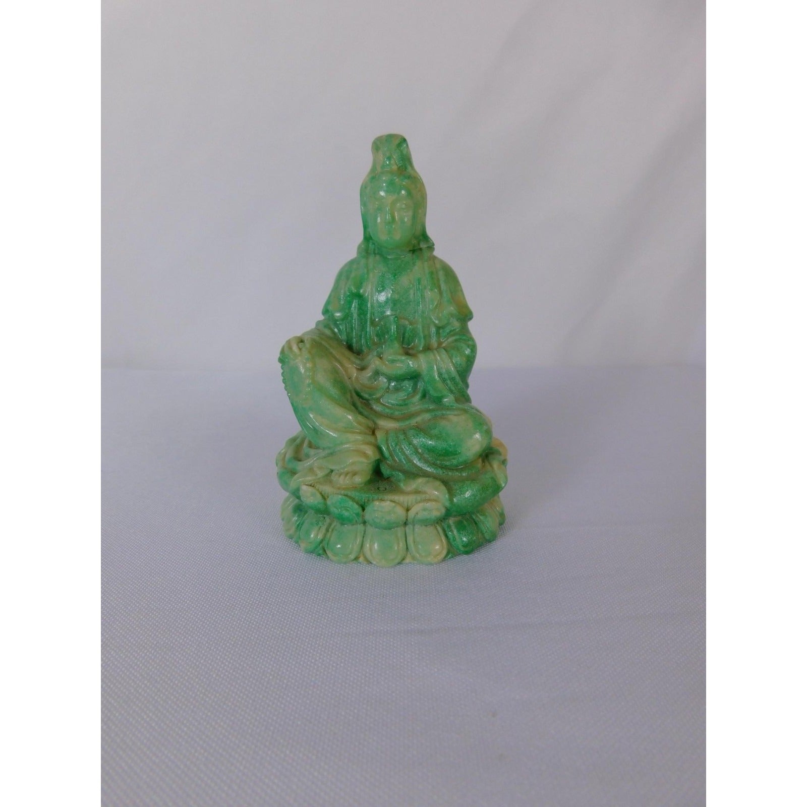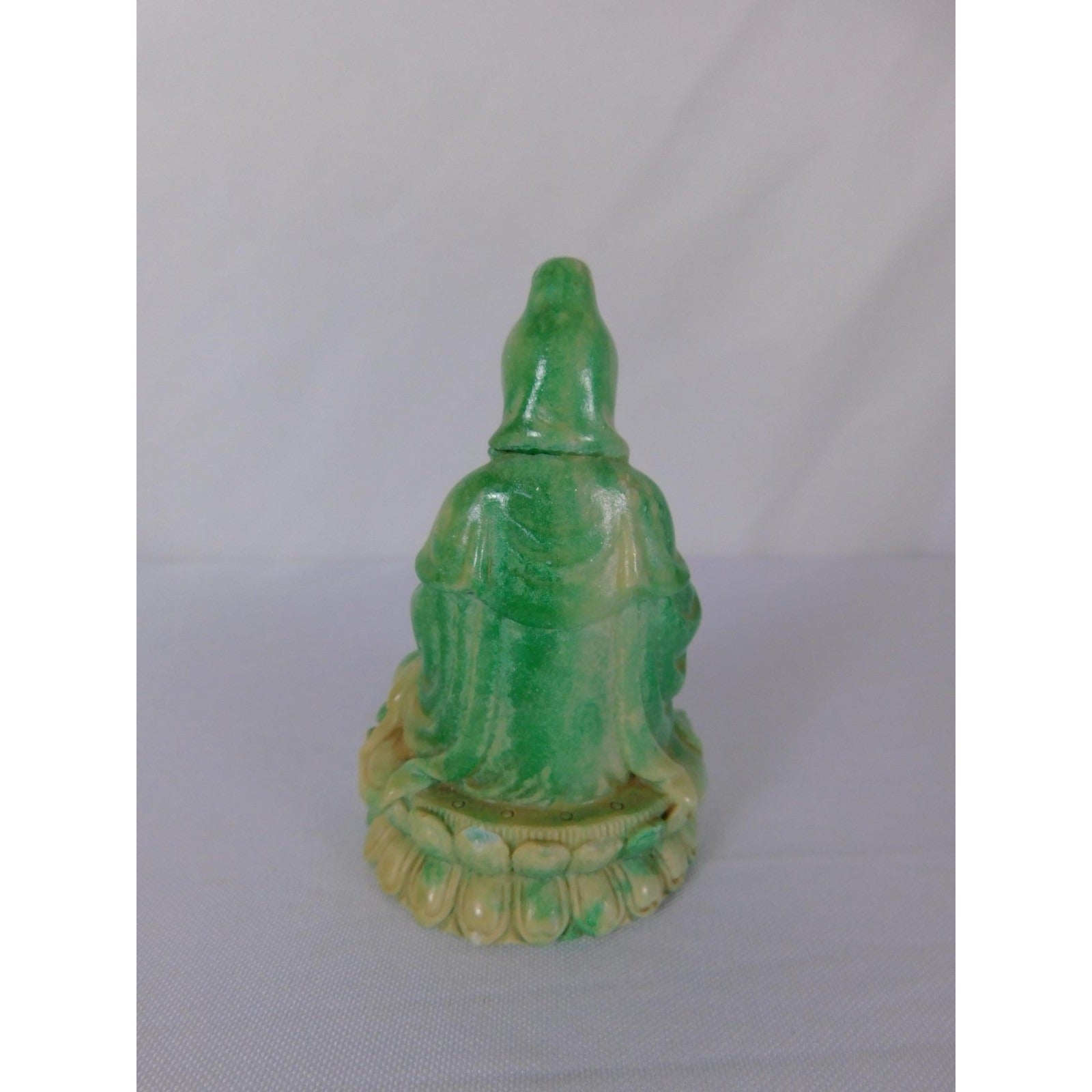 Small green and cream Kwan Yin Buddha statue, ideal for Buddhist altar or meditation space.