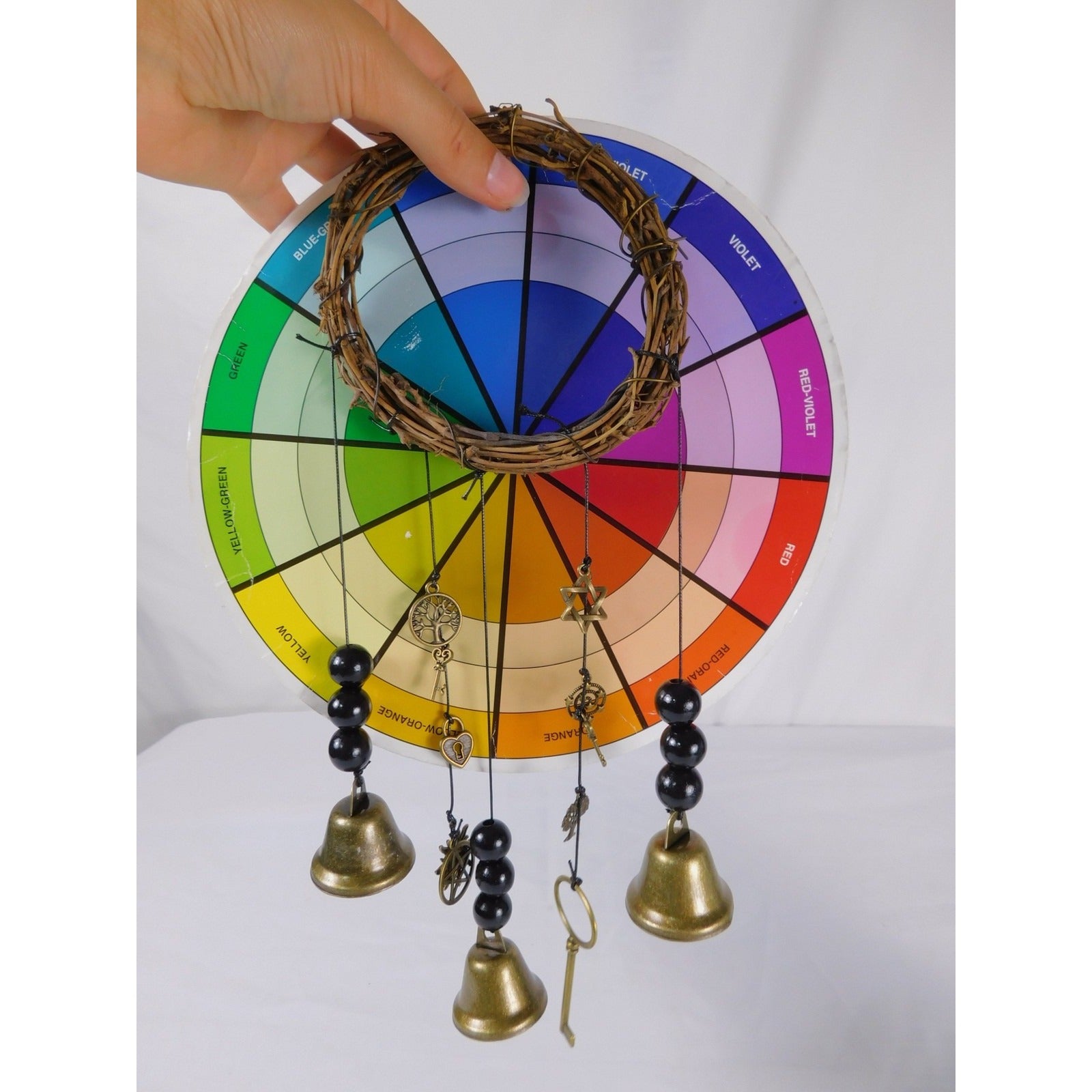 Hang ancient wards with this NWT 4" handmade grapevine wreath—brass bells chime clear, protective charms (keys, pentacle, herbs) dangle like forest spells. Door knocker or altar sentinel for banishing & blessing. Folk & Green Witch essential. The Witches Quest curation.