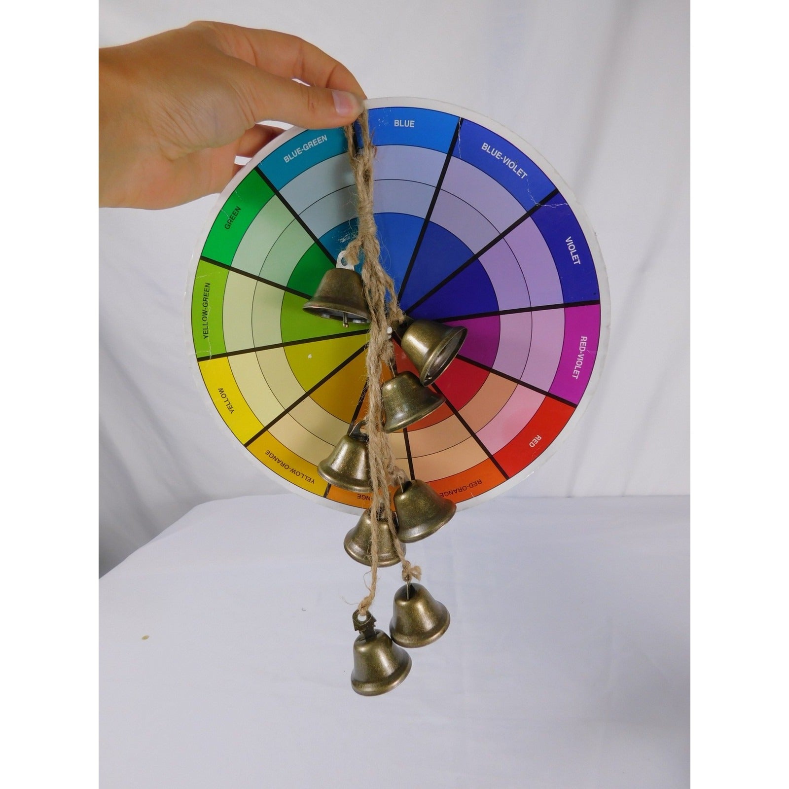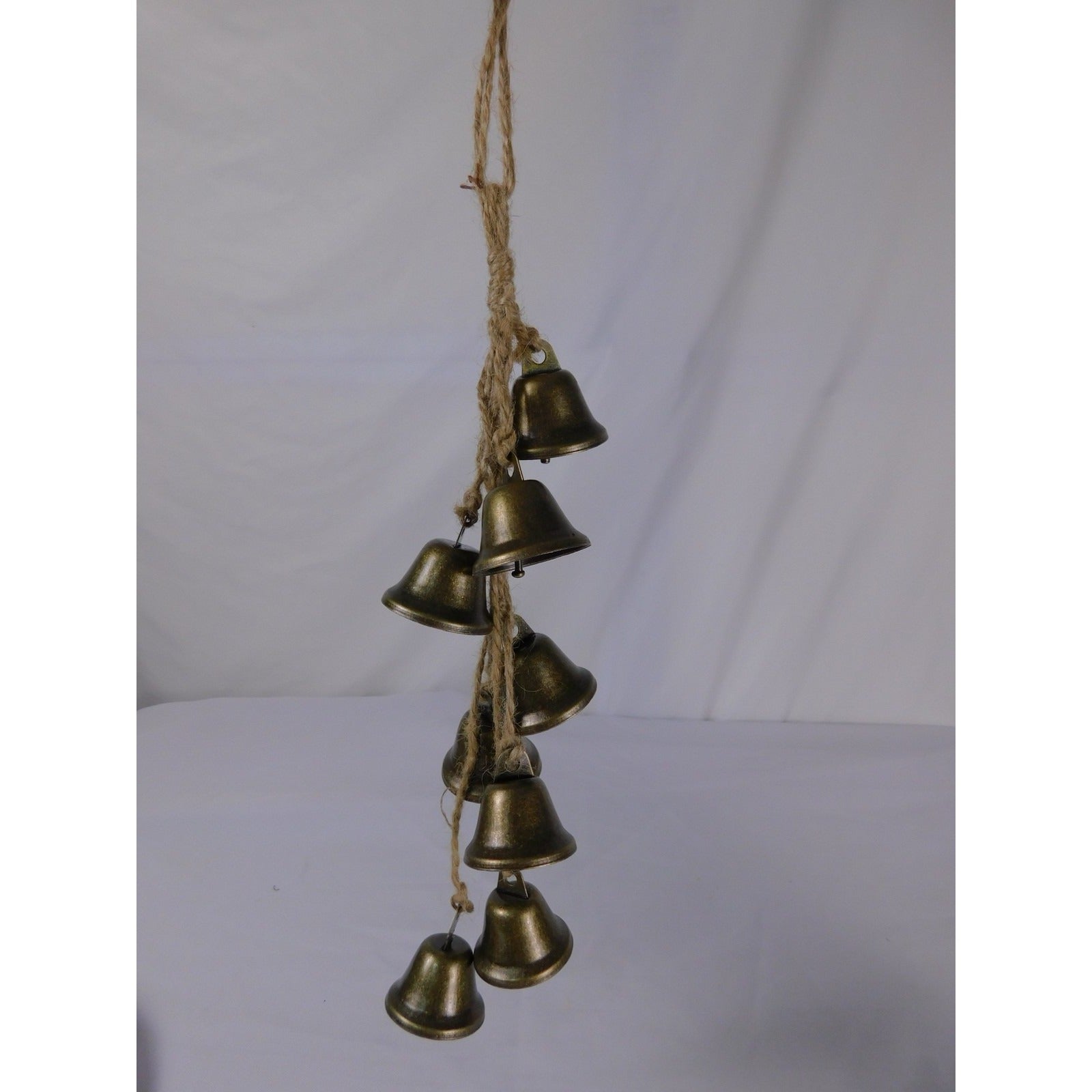Banish shadows with this NWT 16" witch bell strand—7 antique-brass bells (aged patina, clear chime) dangle from rustic jute twine, ready to hang on door, altar, or window. Each ring scatters negativity & summons peace. Folk & Green Witch essential. The Witches Quest curation.