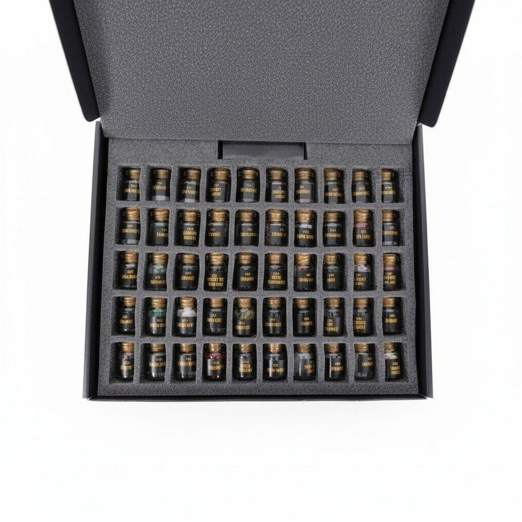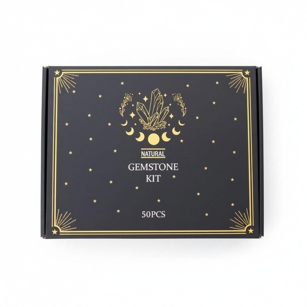 Curated natural gemstone kit featuring 50 mini glass bottles filled with assorted crystal chips and pebbles. Organized in a sleek black, starry presentation box, this set works beautifully for witchcraft altars, spell jars, ritual decor, meditation practice, crystal education, and crafting.
