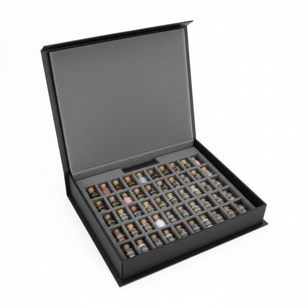 • Pieces Included: 50 gemstone bottles arranged in a grid-style foam tray