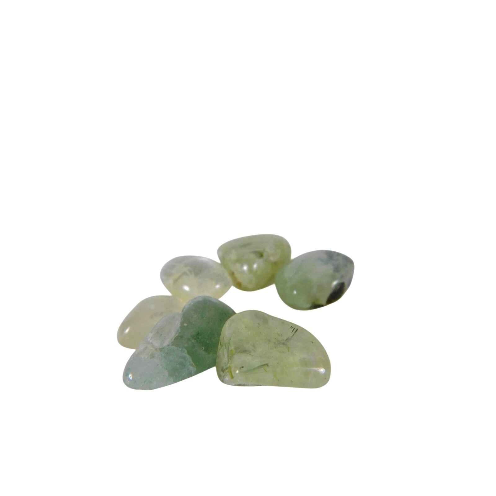 These stones display the characteristic pale green coloring of prehnite, with some pieces showing darker inclusions and internal variation that add depth and uniqueness. Their small size makes them ideal for grouping, crystal bowls, or inclusion in kits rather than as standalone statement pieces.