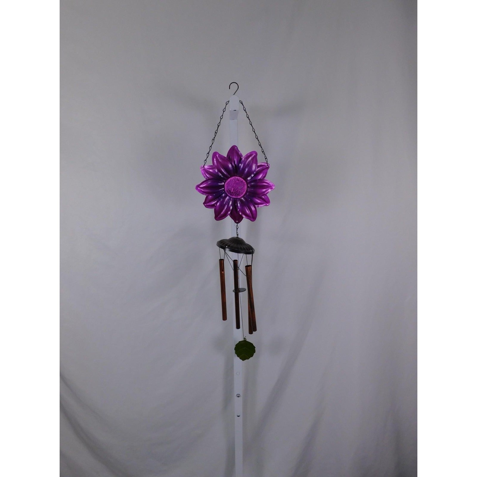 Item: Decorative metal wind chime with a large purple flower topper and copper-tone chimes.