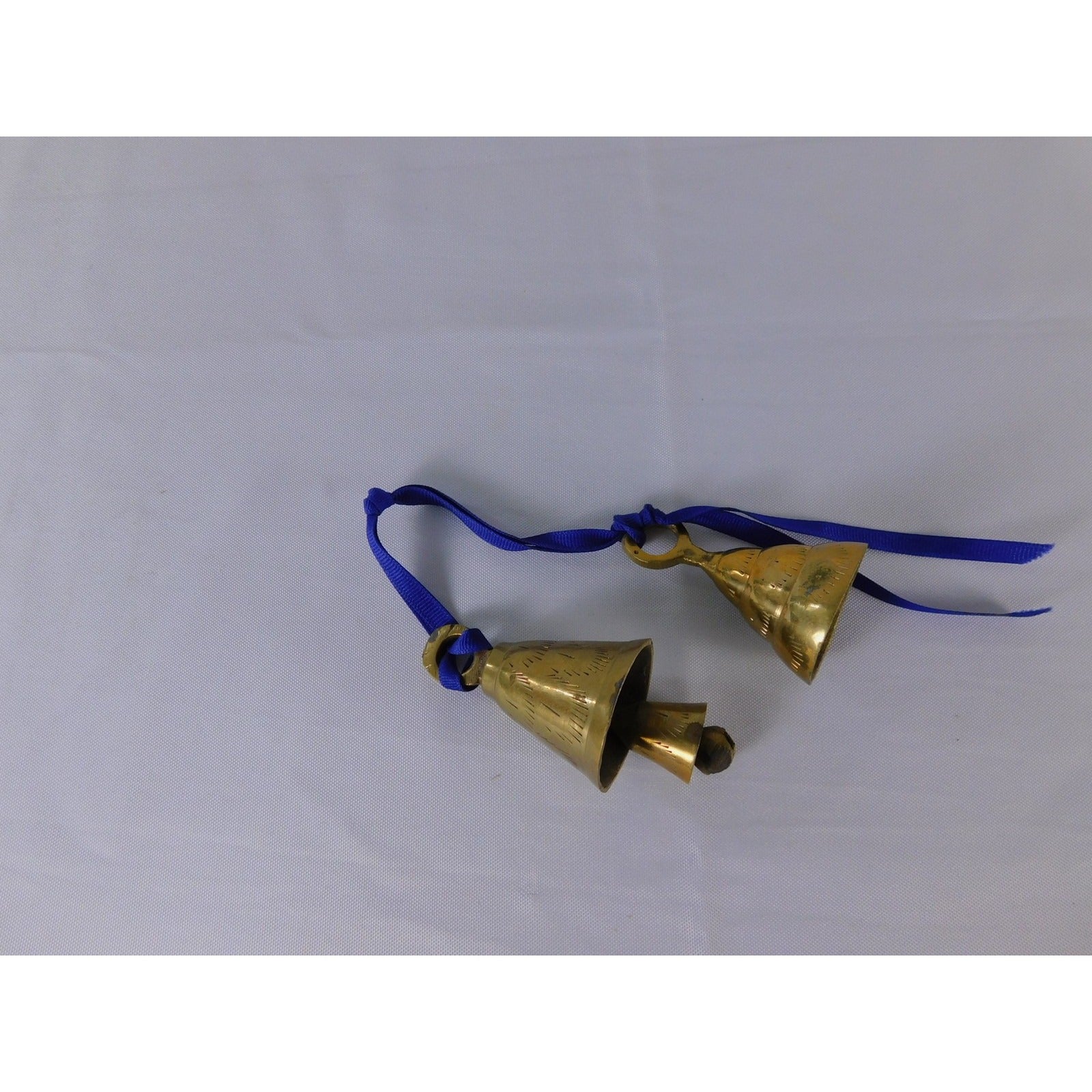 Item: Pair of small etched brass hanging bells with blue ribbon loops for hanging, suitable for altar, doorway, or decorative use.