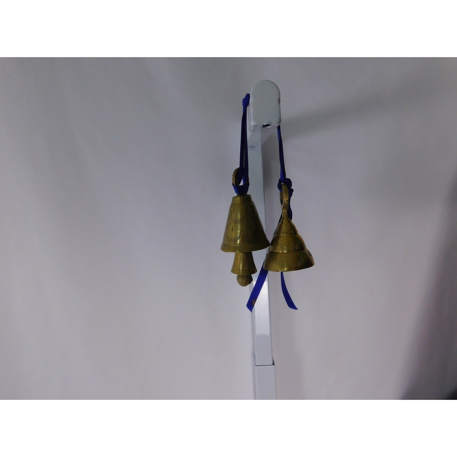 Small Etched Brass Hanging Bells Pair Blue Ribbon Altar Door Chime Decor