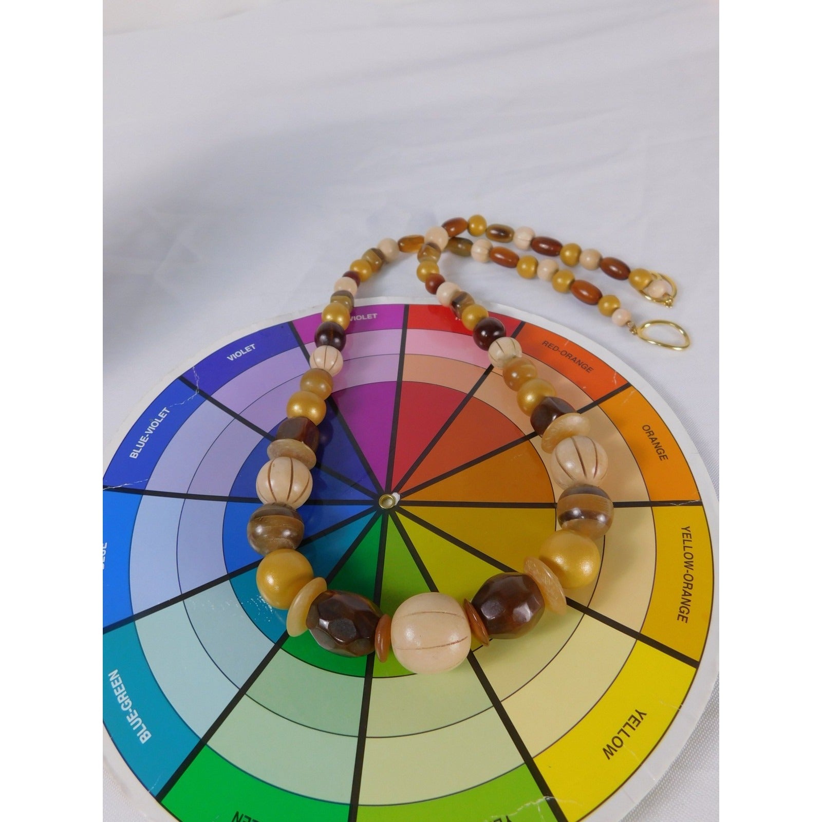 Features large round, disk, and faceted beads in golden yellow, cream, tan, and brown hues
