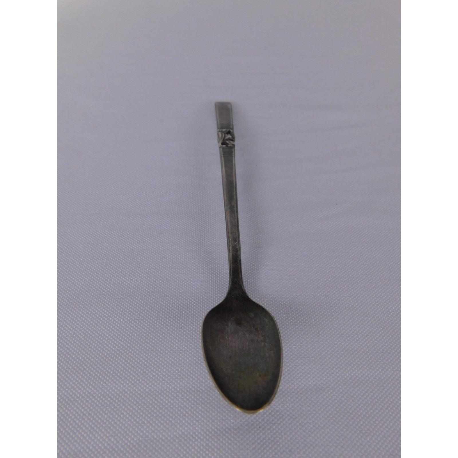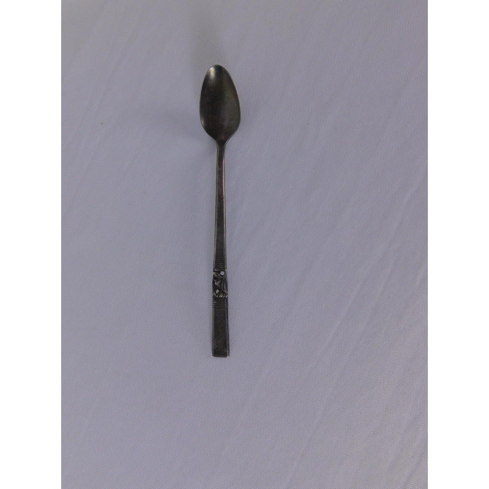 Vintage silver-tone metal teaspoon with a slim neck, oval bowl, and squared handle accented by a raised floral panel. This classic piece is designed for everyday table settings, coffee service, or as a petite serving spoon for sugar and condiments.
