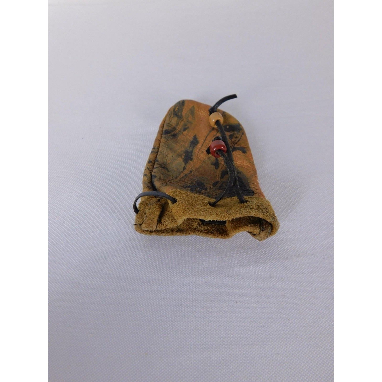 Materials: Crafted from leather with a natural suede interior and a black cord drawstring.